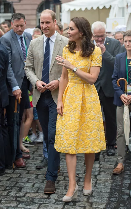Μπορεί να ήταν μια βροχερή μέρα, ωστόσο η Δούκισσα του Cambridge επέλεξε να φορέσει ένα φόρεμα με κίτρινη δαντέλα της σχεδιάστριας Jenny Packham και το συνδύασε με τις αγαπημένες της nude πλατφόρμες.