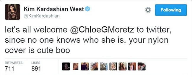 "Ας καλωσορίσουμε όλοι την Chloe Grace Moretz στο Twitter, αφού κανείς δε ξέρει ποια είναι. Το εξώφυλλο σου για το Nylon είναι ωραίο", ήταν η ειρωνική απάντηση της Kim.