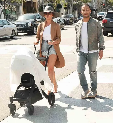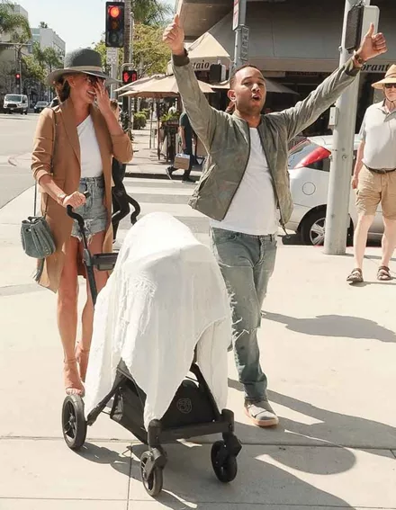 Chrissy Teigan and John Legend shopping and pushing stroller through Beverly Hills, CA