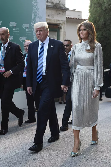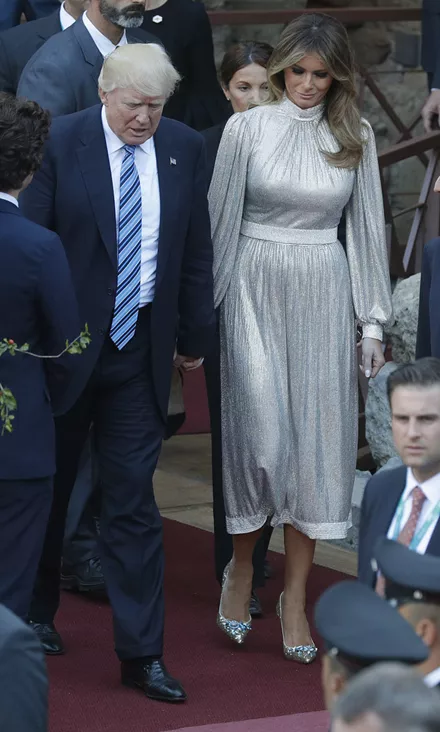 26 Μαΐου Στο αρχαίο ελληνικό θέατρο της Ταορμίνα, στη Σικελία, όπου οι ηγέτες της G7 παρακολούθησαν κονσέρτο από την Ορχήστρα και Χορωδία της La Scala του Μιλάνου. Η Melania, έκανε την πιο λαμπερή της εμφάνιση, με silver φόρεμα από την φθινοπωρινή collection των Dolce&Gabbana ξανά και γόβες του ίδιου οίκου.