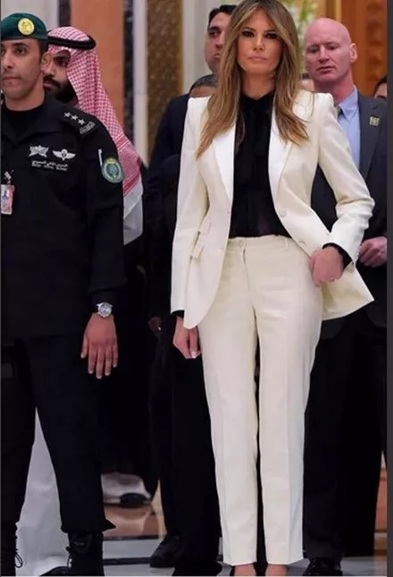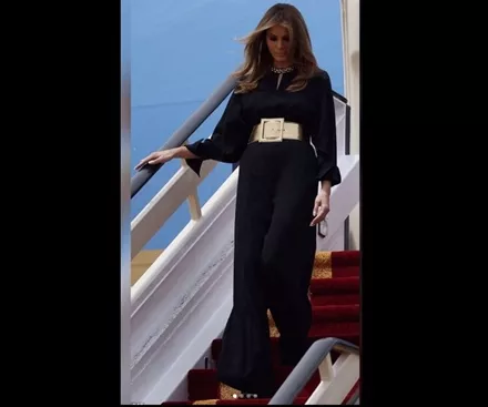 20 Μαΐου Κατά την άφιξή της στη Σαουδική Αραβία, η Melania επέλεξε ένα μαύριο jumpsuit της σχεδιάστριας Stella McCartney.
