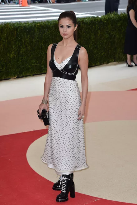 Not!Η Selena Gomez μάλλον νόμιζε πως πήγαινε στο προπέρσινο Met, με θέμα Punk, οπότε και φόρεσε ένα girly πουά φορεματάκι, δερμάτινο κορσέ και αρβύλες... Δεν ήταν πολύ άσχημη εμφάνιση, απλά ήταν άκομψη για την περίσταση και πολύ εκτός θέματος.