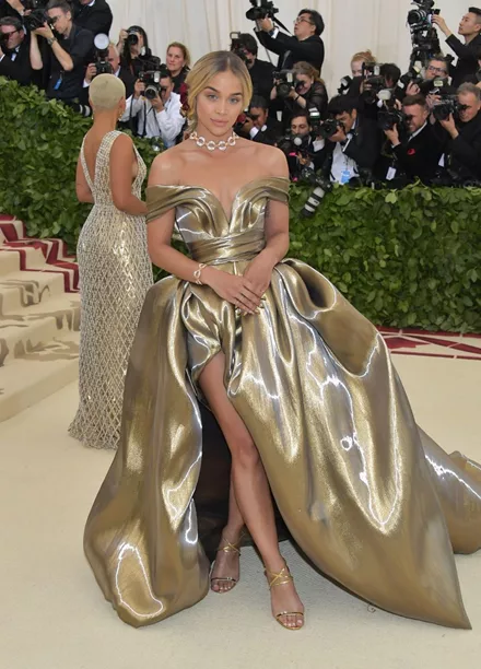 Το μοντέλο και ηθοποιός Jasmine Sanders φορούσε μια ογκώδη τουαλέτα από χρυσό λαμέ ύφασμα. Η τουαλέτα ντράπαρε απαλά στον ώμο και συγκρατιόταν από μια κομψή στενή μέση. Το φόρεμα τελικά κατέληγε σε μια εντυπωσιακή γεμάτη γραμμή, με ψηλό άνοιγμα που αποκάλυπτε τα πόδια της Jasmine, δίνοντας έτσι έμφαση στη μοντέρνα αέρινη γραμμή του.