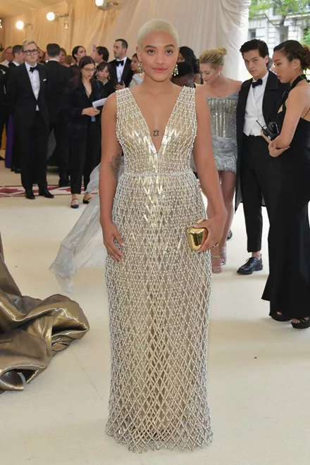 Η ηθοποιός Kiersey Clemons φορούσε ένα φόρεμα γεμάτο χάντρες, σαν πλέγμα από χρυσό και μαργαριτάρια. Αυτό το ρομβοειδές διακοσμημένο δίχτυ εφάρμοζε στενά στο σώμα, και αποτελούνταν από ένα βαθύ ντεκολτέ που κατέληγε σε μια φουσκωτή αλλά ίσια φούστα, την οποία συγκρατούσε ένα μαλακό κρινολίνο, ενώ το διακοσμημένο δίχτυ ακουμπούσε πάνω σε μια αέρινη διαφανή οργαντίνα.