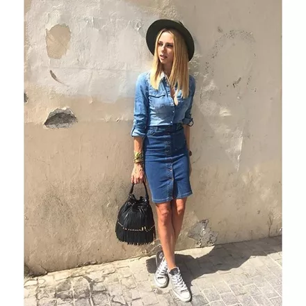 Η Έβελυν Καζαντζόγλου αποδεικνύει ότι το total denim look θα έχει για μια ακόμα σεζόν δυναμική παρουσία, ενώ ακολουθεί κάθε ύφος που επιλέγουμε με τα ανάλογα αξεσουάρ