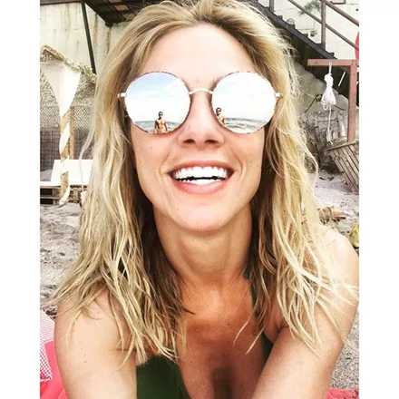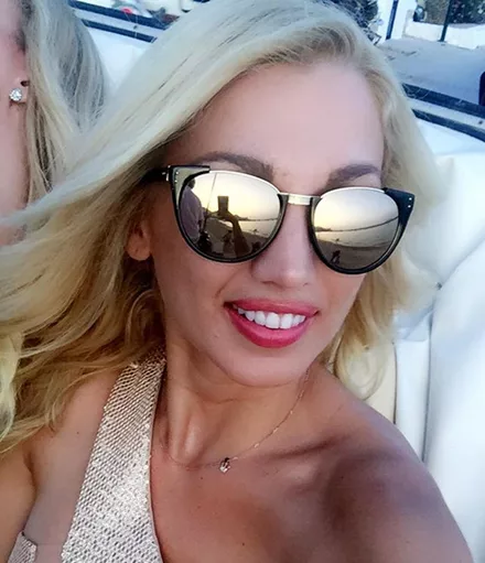Η Ντορέττα Παπαδημητρίου με στρογγυλά γυαλιά ηλίου και mirror glass που αντικατοπτρίζει την θέα της
