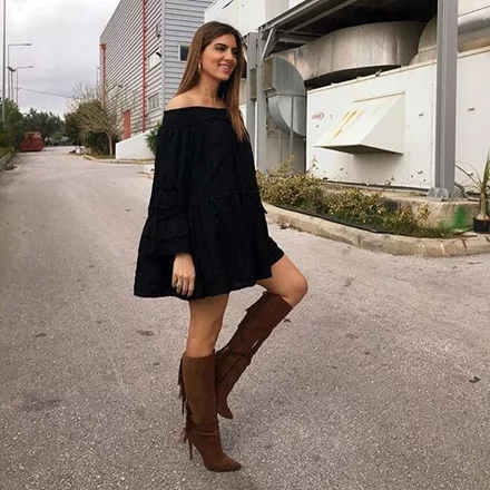 Η Σταματίνα Τσιμτσιλή ακολουθεί ένα boho ύφος, μην μπορώντας να αποχωριστεί τις μπότες της με τα χαρακτηριστικά κρόσσια. Σημείωσε ότι ένα τέτοιο φόρεμα σε βγάζει από τη δύσκολη θέση όλες τις ώρες της ημέρας
