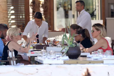 Ο φωτογραφικός φακός την απαθανάτισε να απολαμβάνει τον ήλιο και τη θάλασσα της Μυκόνου παρέα με την συνεργάτιδα και φίλη της Μαριλένα Παναγιωτοπούλου. Οι δυο τους, χαλαρές και χαρούμενες, απόλαυσαν δείπνο σε γνωστό παραθαλάσσιο μαγαζί του νησιού.