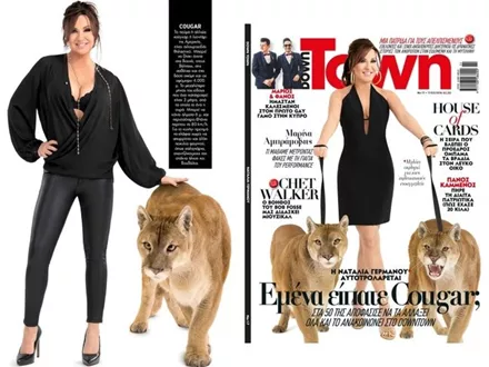 Όταν μου το είχαν πει πρώτη φορά δεν ήξερα τι ήταν αυτό. Νομίζω πως ο Κωστόπουλος μου το είπε πριν από εφτά χρόνια περίπου και έτρεξα πανικόβλητη να δω τι είναι. Άνοιξα τα μάτια μου διάπλατα, γιατί το κούγκαρ είναι ένα αρπακτικό άγριο ζώο το οποίο αρπάζει τρυφερά μικρά ζωάκια και τα κατασπαράζει (γέλια). Η αλήθεια είναι ότι σοκαρίστηκα, αλλά δεν ταυτίστηκα με αυτό. Πάντα με χιούμορ τα έβλεπα, για τον απλό λόγο –που μπορεί ν’ ακούγεται απίστευτος αλλά ισχύει– ότι σε καμία από τις σχέσεις που είχα με νεότερους συντρόφους δεν έκανα εγώ το πρώτο βήμα. Τώρα μπορεί να λένε «σιγά τα ψέματα», αλλά σας το ορκίζομαι δεν λέω ψέματα.