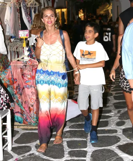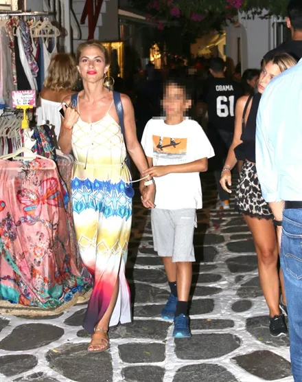 Ο φωτογραφικός φακός απαθανάτισε την Ντορέττα Παπαδημητρίου στα σοκάκια της Μύκονου να απολαμβάνει τη βόλτα της μαζί με τον γιο της.
