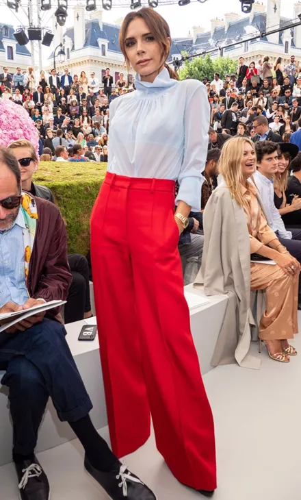 Η Victoria Beckham με ένα εντυπωσιακό ψηλόμεσο κόκκινο φαρδύ παντελόνι στο show του Dior Homme.