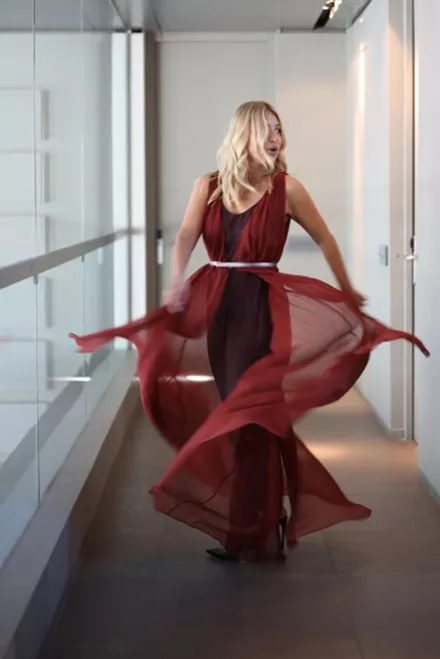 Η Μαρία Ηλιάκη έδωσε άλλον... αέρα στην ολόσωμη φόρμα της, η οποία ξεχωρίζει λόγω των διαφανειών που την κάνουν να δείχνει σαν φόρεμα.