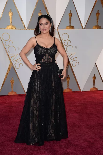 Η Salma Hayek με φόρεμα Alexander McQueen, παπούτσια Sophia Webster και κοσμήματα Fred Leighton.
