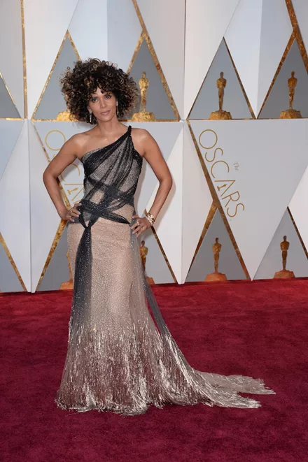 Η Halle Berry με περίτεχνο Versace spring 2017 couture και άφρο μαλλί.