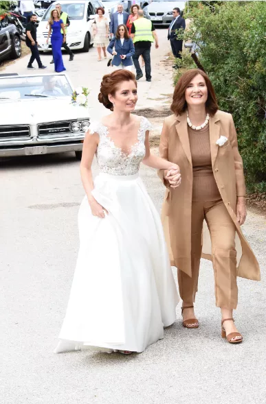 Τον γαμπρό και τη νύφη συνόδευσαν στην εκκλησία οι μαμάδες τους. Η Φαίη Κουτζούκου κατέφθασε στον ναό μέσα σε ένα λευκό αυτοκίνητο και έκλεψε τις εντυπώσεις.
