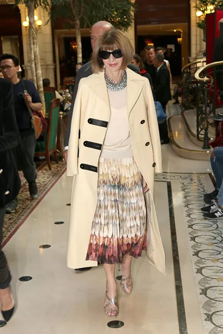 Η Anna Wintour δε θα μπορούσε να λείψει από την παρουσίαση της συλλογής Balmain. Επέλεξε φούστα με ντεγκραντέ μοτίβο, μπεζ μπλούζα και παλτό