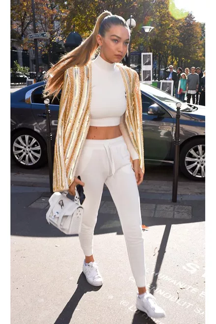 Η Gigi Hadid κατέφτασε σε fashion show με λευκή φόρμα και crop top και εντυπωσιακό πανωφόρι