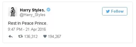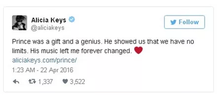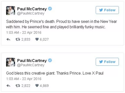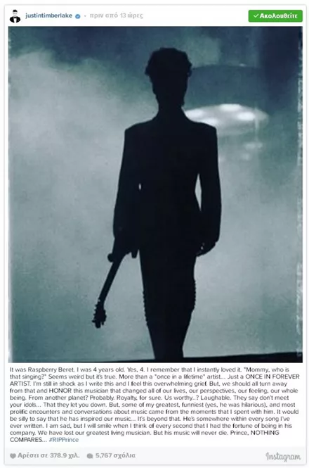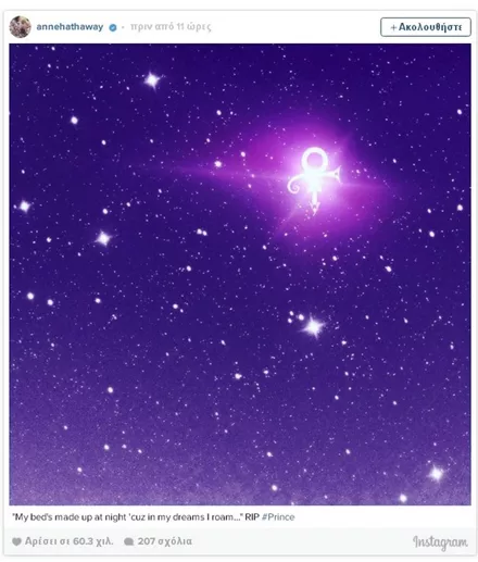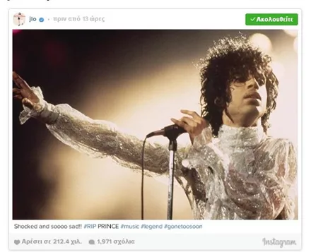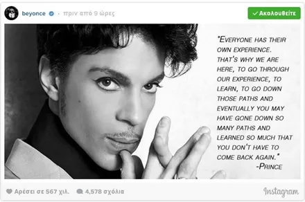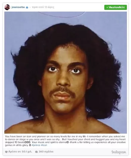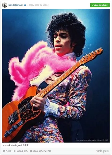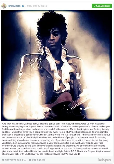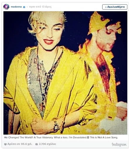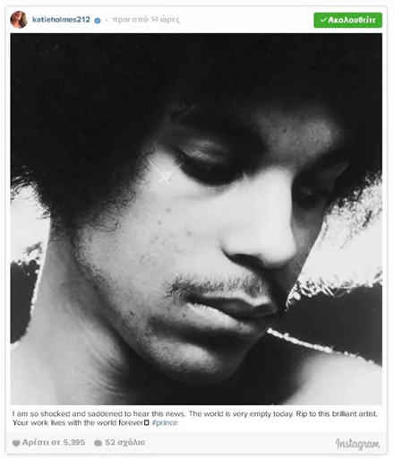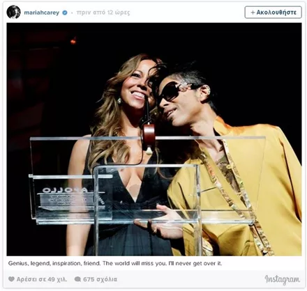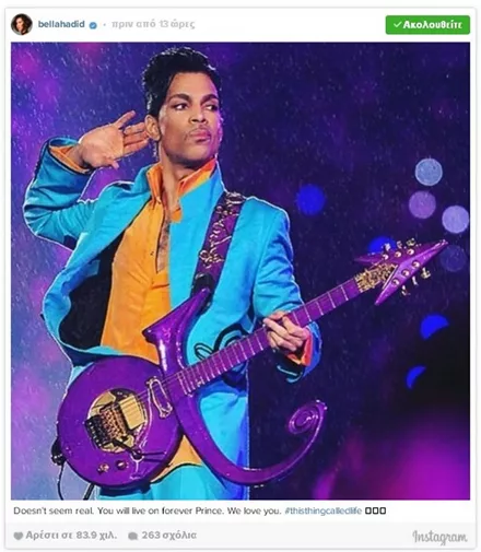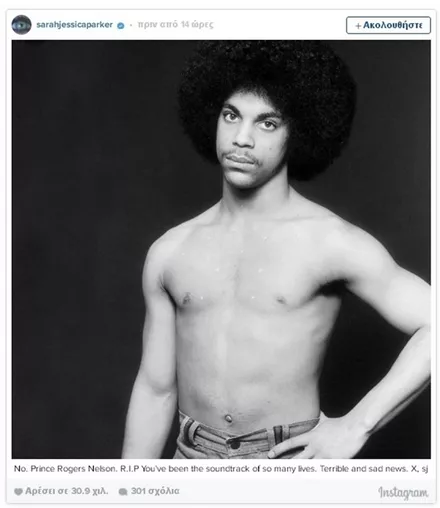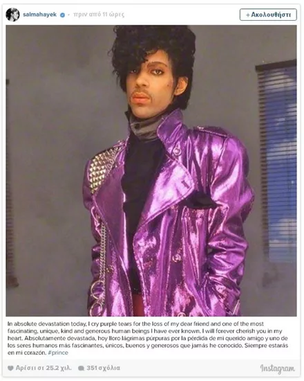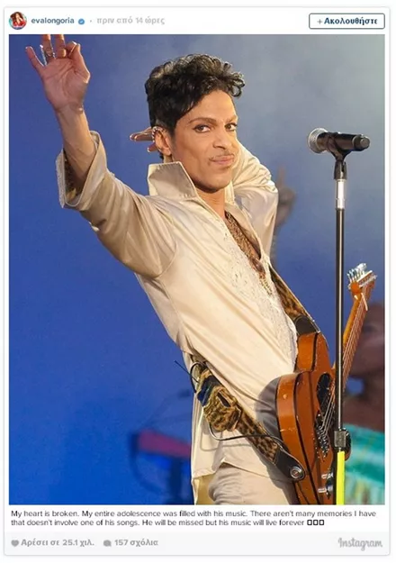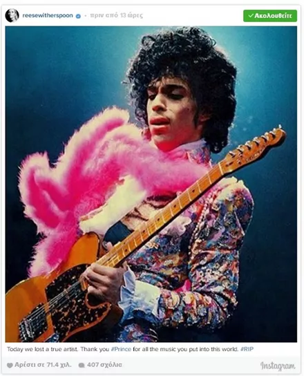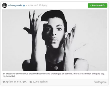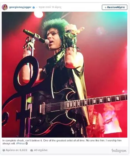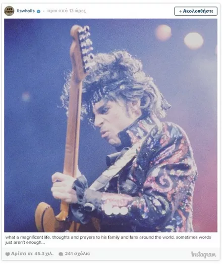 Σαν κεραυνός εν αιθρία έπεσε χθες η είδηση του απρόσμενου και ξαφνικού θανάτου του Prince, μόλις στα 57 του χρόνια. Σύσσωμος ο καλλιτεχνικός κόσμος θρηνεί για την τεράστια αυτή απώλεια από τη διεθνή μουσική σκηνή, με τους μεγαλύτερους σταρς να αναρτούν συνεχώς μηνύματα για τον αιφνίδιο χαμό του καλλιτέχνη.