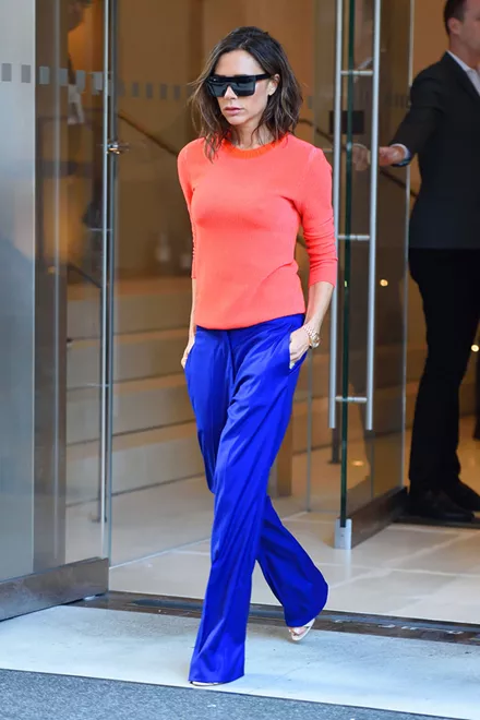 Ο λόγος για τη... Victoria Beckham που εδώ και λίγους μήνες έχει απομακρυνθεί σημαντικά από την αγαπημένη της ουδέτερη παλέτα. H επιτυχημένη, πλέον, σχεδιάστρια εμφανίστηκε χτες στη Νέα Υόρκη με αέρινο έντονο μπλε παντελόνι και στενό πορτοκαλί top με κλειστή λαιμόκοψη.
