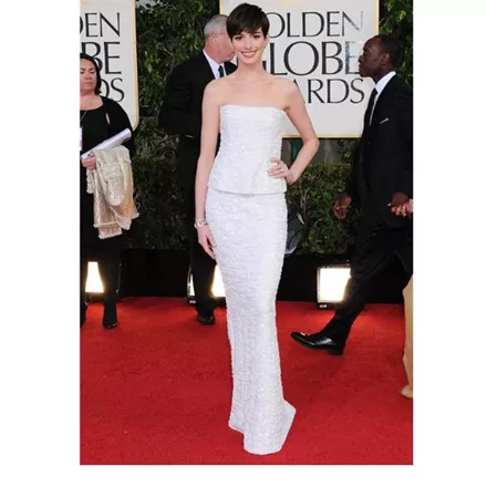 H Anne Hathaway φόρεσε στο κόκκινο χαλί Chanel φόρεμα, παλτό και κοσμήματα, Aldo οικολογικά παπούτσια και Roger Vivier τσάντα