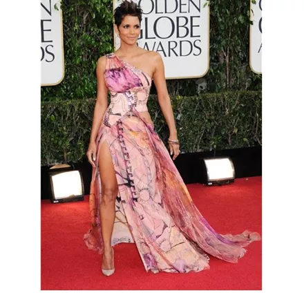 Mιμούμενη την περίφημη στάση της Jolie, η Halle Berry έβγαλε το πόδι της μέσα από ένα ροζ φόρεμα Atelier Versace Fall 2012 με έναν ώμο και περίεργα patterns.