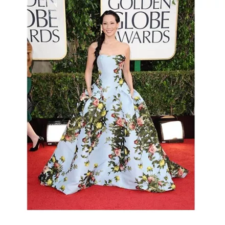 H Lucy Liu με Carolina Herrera φόρεμα, Ferragamo clutch, Lorraine Schwartz κοσμήματα και Giuseppe Zanotti παπούτσια