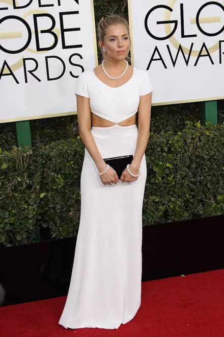 H Sienna Miller επέλεξε μίνιμαλ φόρεμα Michael Kors Collection και κλασικό κολιέ με μαργαριτάρια