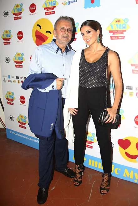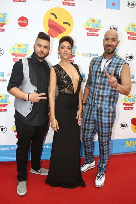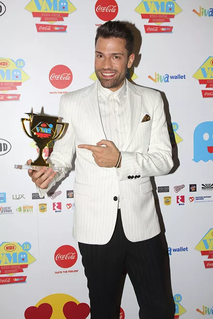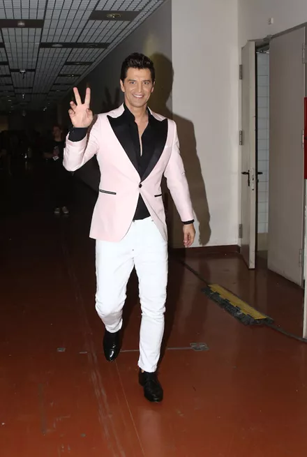 O Σάκης Ρουβάς έκανε μια μικρή εμφάνιση πριν την έναρξη των βραβείων με ροζ σακάκι Giorgos Papadogamvros και παντελόνι Dsquared.
