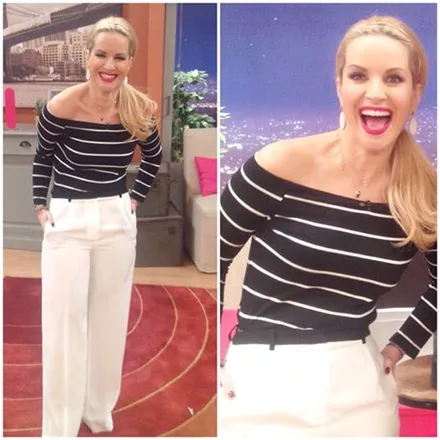 Το κλασικό nacy look ακολούθησε η Μαρία Μπεκατώρου, συνδυάζοντας ρίγες με λευκό παντελόνι ενώ δεν παρέλειψε να ολοκληρώσει με κόκκινο κραγιόν!