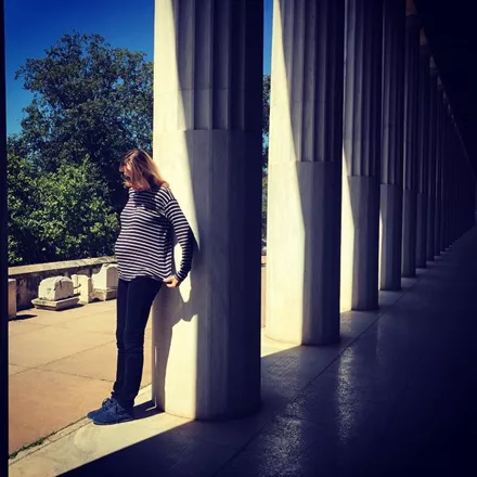 Η Δέσποινα Καμπούρη επέλεξε (και κατάφερε) να δώσει έμφαση μέσα από ένα μόνο κομμάτι, μια ριγέ φούστα έντονες αποχρώσεις. Τέλος, κράτησε την ισορροπία με ένα λευκό πουκάμισο και nude γόβες