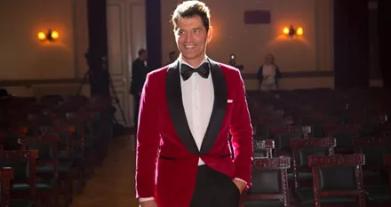 Ο Σάκης, όπως ήταν αναμενόμενο, μαγνήτισε τα βλέμματα επιλέγοντας ένα κόκκινο βελούδινο σακάκι και μαύρο παντελόνι.