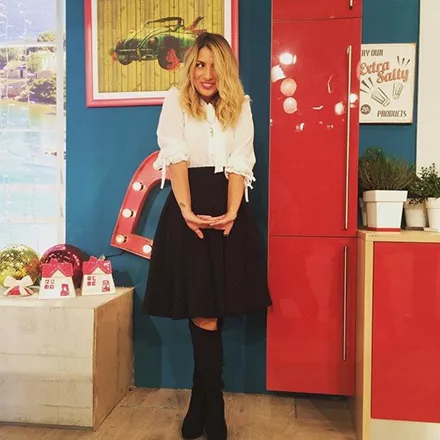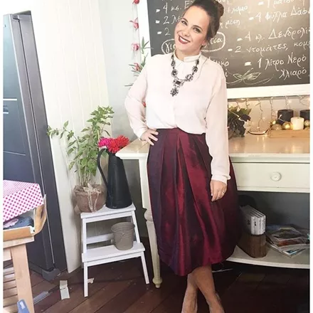 Από την άλλη, η Ελιάνα Χρυσικοπούλου είναι έτοιμη για το ρεβεγιόν, επιλέγοντας το τόσο εορταστικό και αρχοντικό μπορντό χρώμα για μια φούστα σε γραμμή Α. Τα αξεσουάρ παράλληλα αναβάθμισαν το look