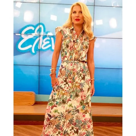 Η Ελένη Μενεγάκη δεν αγαπάει μόνο τα λουλούδια αλλά και τα φορέματα και η επιλογή αυτή της ταιριάζει πολύ. Τα κοσμήματα της είναι Folli Follie από τη νέα καμπάνια Silver Summer