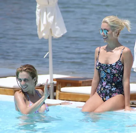 Ο φωτογραφικός φακός απαθανάτισε τις τρεις παρουσιάστριες να απολαμβάνουν παρέα τις βουτιές στην πισίνα.