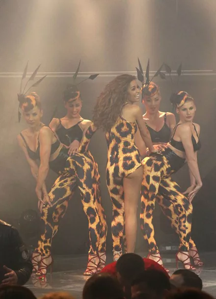 Η Ελένη Φουρέιρα με ολόσωμη φόρμα leopard print Apostolos Mitropoulos με κρύσταλλα και χρυσά πέδιλα Miu Miu