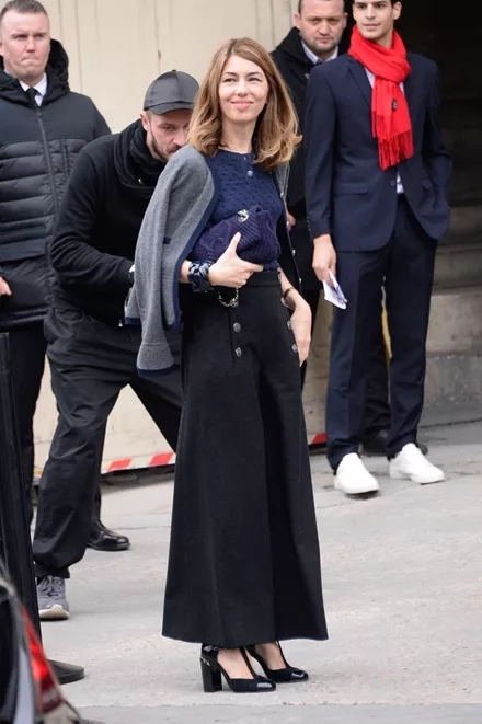Η Sofia Coppola με ψηλόμεση παντελόνα και γκρι σακάκι στο show Chanel show