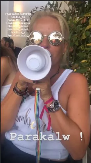 Μαζί με την κουμπάρα της, Μαρία Μπεκατώρου, και την υπόλοιπη παρέα της η σχεδιάστρια πέρασε μια πολύ ξεχωριστή στο νησί των Ανέμων, γευματίζοντας και διασκεδάζοντας.