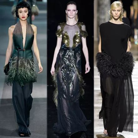 Night owls. Τα φτερά στρουθοκαμήλου, στοιχείο των couture συλλογών, διακοσμούν φέτος τα βραδινά φορέματα. Μαλακά και ελαφριά προσδίδουν κομψότητα και χάρη, προσθέτοντας την απαραίτητα αίσθηση πολυτέλειας στις εμφανίσεις.