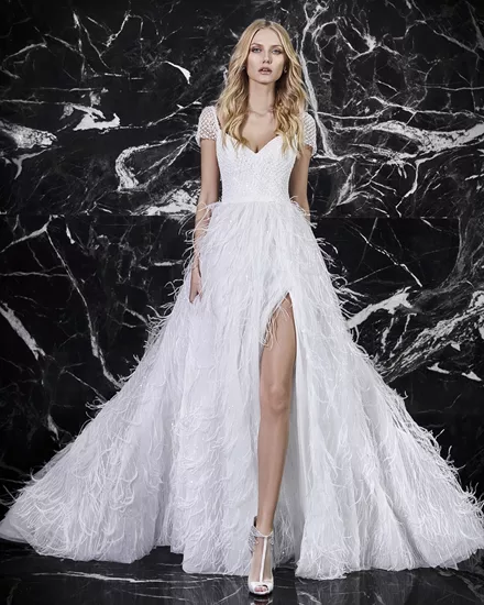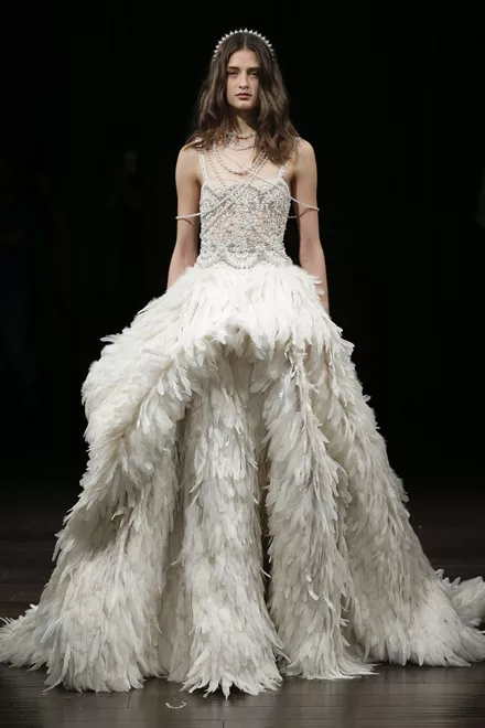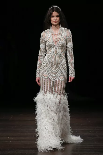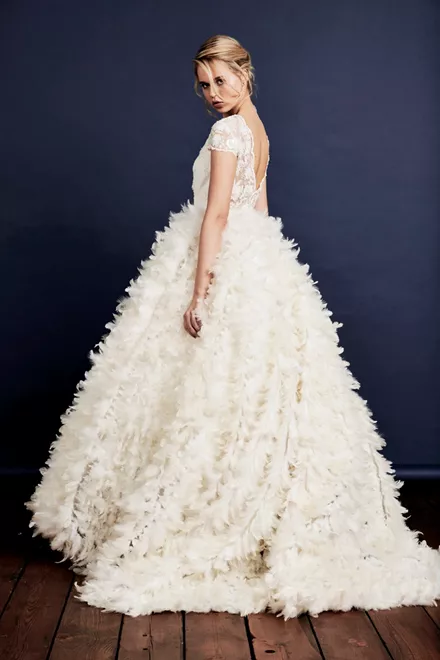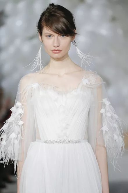 Για φέτος την τιμητική τους έχουν τα απλικαρισμένα λουλούδια, τα λεπτεπίλεπτα φτερά καθώς και τα ογκώδη βολάν. Τα πιο τολμηρά νυφικά συνδυάζουν αριστοτεχνικά και τις τρεις τάσεις αν και εμείς τις συναντήσαμε σε όλους τους πιθανούς συνδυασμούς.