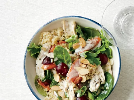-Ανακάτεψε καλά το υπόλοιπο αλάτι με το γιαούρτι, το μέλι, το νερό, το χυμό λεμονιού, το κύμινο και το πιπέρι σε ένα μπολ. Πρόσθεσε το κινόα, τα καρότα, το κοτόπουλο, τα σταφύλια, το κρεμμυδάκια, τον μαϊντανό και τα αμύγδαλα.