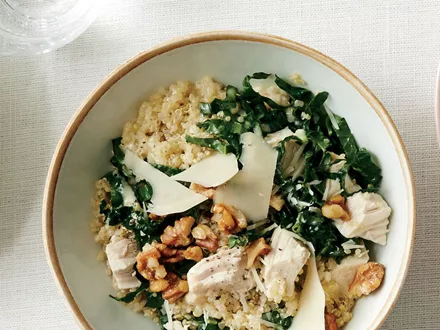 -Σε ένα μπολ ανακάτεψε το kale, την quinoa και το στήθος κοτόπουλο, ψημένο.