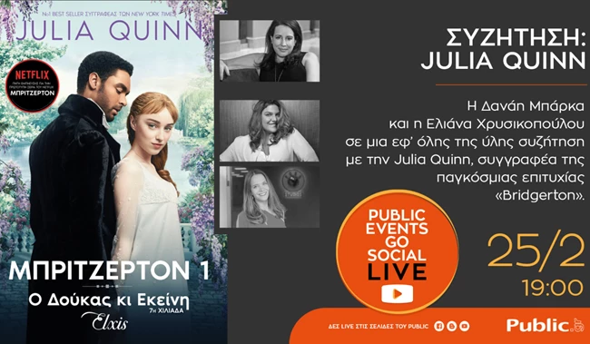 Την Πέμπτη 25 Φεβρουαρίου στις 19.00 τη σκυτάλη παίρνει η πολυβραβευμένη συγγραφέας του παγκόσμιου best-seller "Οικογένεια Μπρίτζερτον", Julia Quinn. Η κ. Quinn θα συζητήσει με τις Δανάη Μπάρκα και Ελιάνα Χρυσικοπούλου σχετικά με την επιτυχία-ρεκόρ του βιβλίου της, όπου βασίστηκε η τηλεοπτική σειρά του Netflix "Bridgerton” (Μπρίτζερτον) αλλά και για τη συνεχόμενη πρωτιά στις best seller λίστες των New York Times. Η τηλεοπτική σειρά είναι βασισμένη στο πρώτο από τα οκτώ βιβλία της Julia Quinn και μας μεταφέρει στην εποχή της Αντιβασιλείας στη Βρετανία, σε ένα ταξίδι γεμάτο ίντριγκες, πάθη και δυναμικές ηρωίδες που παίρνουν την κατάσταση στα χέρια τους, χωρίς να περιμένουν έναν όμορφο πρίγκιπα να τις σώσει.