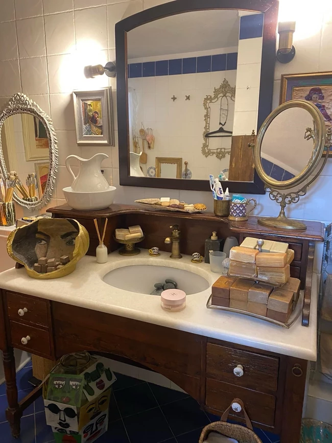 Στα μπάνια του σπιτιού αξιοποιήθηκαν παλιά έπιπλα και διακοσμητικά αντικείμενα.