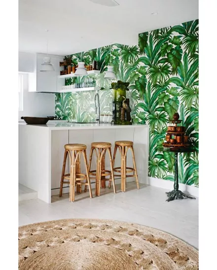 Ανανέωσε την κουζίνα καλύπτοντας έναν τοίχο με μια τολμηρή ταπετσαρία. Επίλεξε μικροαντικείμενα στο ύφος του μοτίβου της.