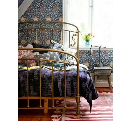 Στο υπνοδωμάτιο παίξε με maximal ταπετσαρίες και φαινομενικά αταίριαστα μεταξύ τους υφάσματα και χρώματα