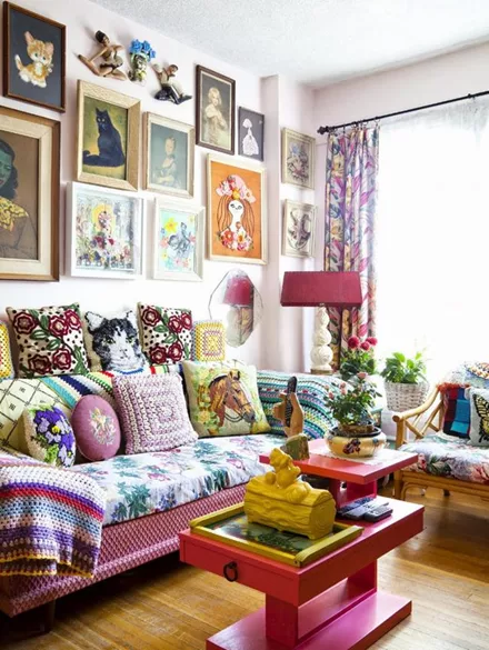 Αν φοβάσαι το έντονο χρώμα στον τοίχο, επίλεξέ το στις ταπετσαρίες των επίπλων και διακόσμησε με ethnic και ποικίλα στοιχεία για "eclectic" αποτέλεσμα