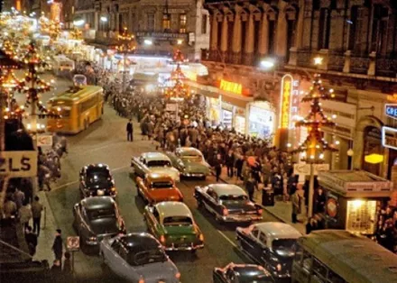 Ο φωτογραφικός φακός και το ταλέντο δύο μεγάλων φωτογράφων της εποχής, του Κώστα Μπαλάφα και του Δημήτρη Χαρισιάδη, αποτυπώνουν με τον πιο όμορφο τρόπο τη γιορτινή ατμόσφαιρα της πόλης και την εορταστική διάθεση των κατοίκων της. Αξίζει να κοιτάξεις τις λεπτομέρειες στην κάθε φωτογραφία και να κάνεις ένα ταξίδι στο χρόνο μέσα από τις επιγραφές, τις βιτρίνες, τα αυτοκίνητα και τον εορταστικό στολισμό.