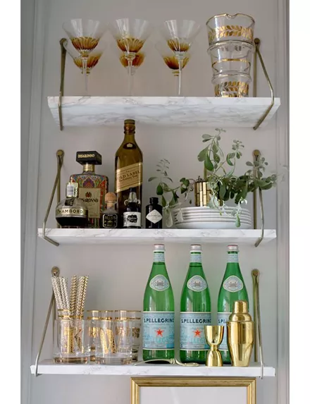 Δεν έχεις χώρο για ένα chic trolley bar; Μερικά μικρά ράφια σε ένα στενό τοίχο μπορούν να το αντικαταστήσουν!