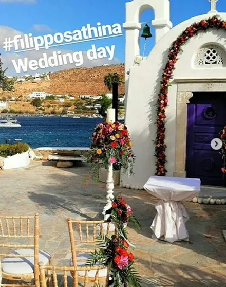 Το διάσημο ζευγάρι πραγματοποίησε τη γαμήλια τελετή, το απόγευμα του Σαββάτου, σε ξωκκλήσι της Μυκόνου, παρουσία πολλών συγγενών και φίλων, ενώ στη συνέχεια ακολούθησε δεξίωση στο εξωτερικό χώρο και δίπλα στην πισίνα του ξενοδοχείου Kivotos, που αποτελεί οικογενειακή επιχείρηση του Φίλιππου Μιχόπουλου.