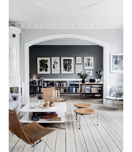Το ανοιχτό γκρι μπορεί να υπογραμμίσει τέλεια τις αρχιτεκτονικές λεπτομέρειες του χώρου, όπως πχ. τα γύψινα διακοσμητικά της οροφής και τα ανοίγματα